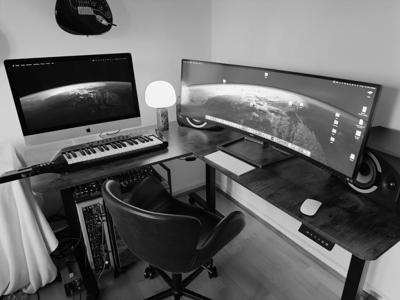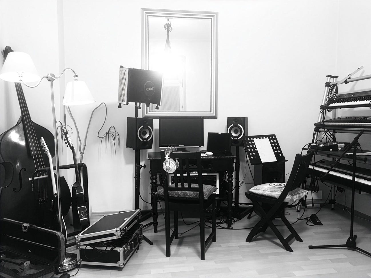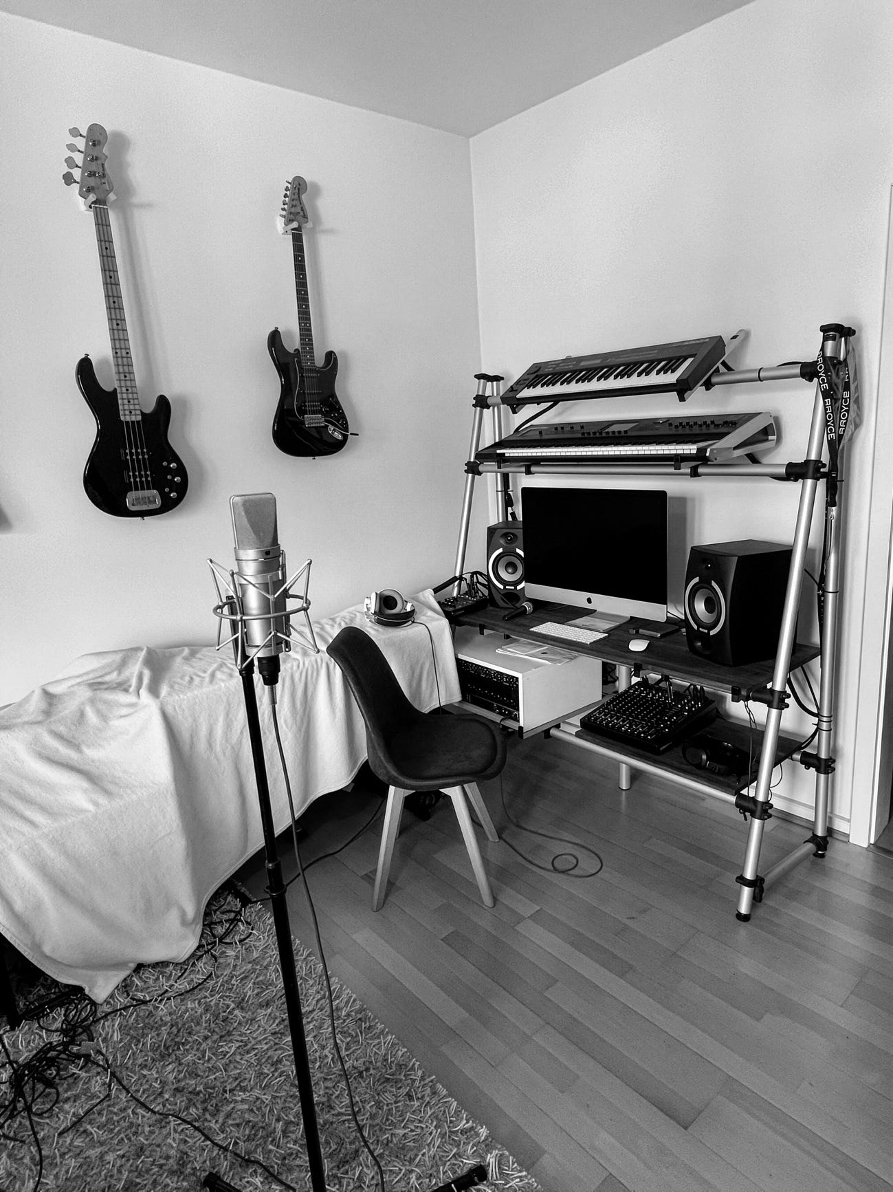 Aquí puedes ver fotos de mi estudio para que puedas ver como ha evolucionado con el tiempo. Entre 2007 y 2021 he utilizado siempre el mismo MacBook. No tenía la capacidad que tienen ordenadores de hoy. Entonces tenía que dividir las canciones en varios proyectos. Por ejemplo, si grababa una orquesta tenia que utilizar un proyecto para cada voz. Era mucho trabajo. El antiguo MacBook se destruyó definitivamente durante el rodaje del Video para la canción Cosplay: